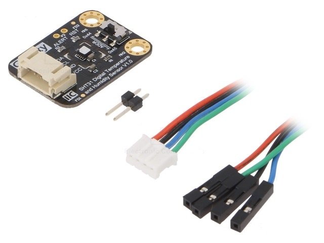 Датчик EN0334 DFROBOT температура и влага със захранващо напрежение от 3.3 до 5VDC, интегрална схема SHT31-F и обхват температура от -40 до 125°C/±0.2°C. Обхват влажност от 0 до 100% RH/±2%.