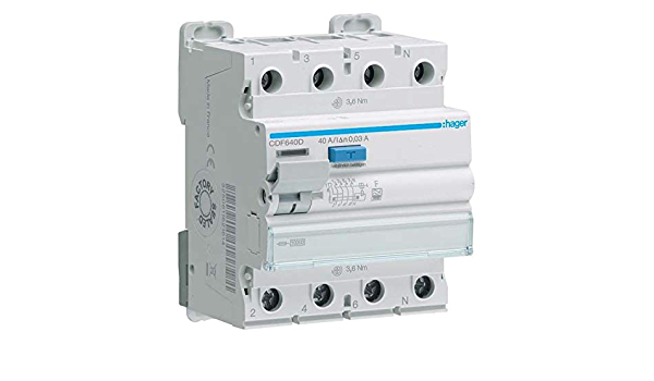 Дефектнотокова защита CDF640D с номинално напрежение 230/400V, номинален ток 40A и диференциален ток 30mA. Ток на късо съединение 10kA и монтаж DIN шина.
