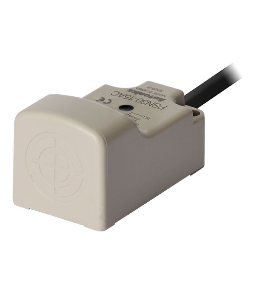 Индуктивен датчик PSN30-15AC без преход екраниран със захранващо напрежение от 100 до 240VAC, контакти NC и номинално разстояние Sn 15мм. Габаритни размери 30x30x53мм и степен на защита IP67.