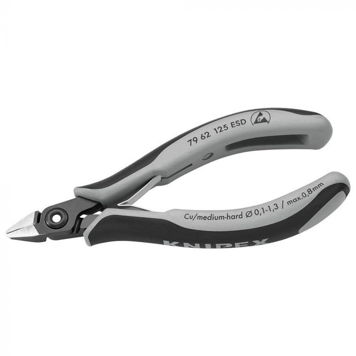 Клещи резачки 7962125ESD KNIPEX за странично рязане, мека тел макс. ф1.3мм и материал на инструмента стомана. Дължина на инструмента 125мм.