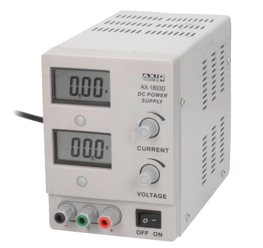 Регулируем захранващ блок AX-1803D със захранващо напрежение 230VAC, макс. товар на изхода 18VDC/3A и макс. мощност 54W. Защита от претоварване, защита от късо и защита при обърнат поляритет.