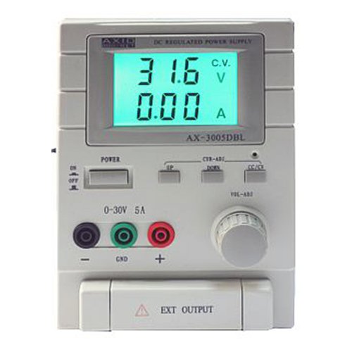 Регулируем захранващ блок AX-3005DBL със захранващо напрежение 230VAC, макс. товар на изхода 30VDC/5A и макс. мощност 150W.