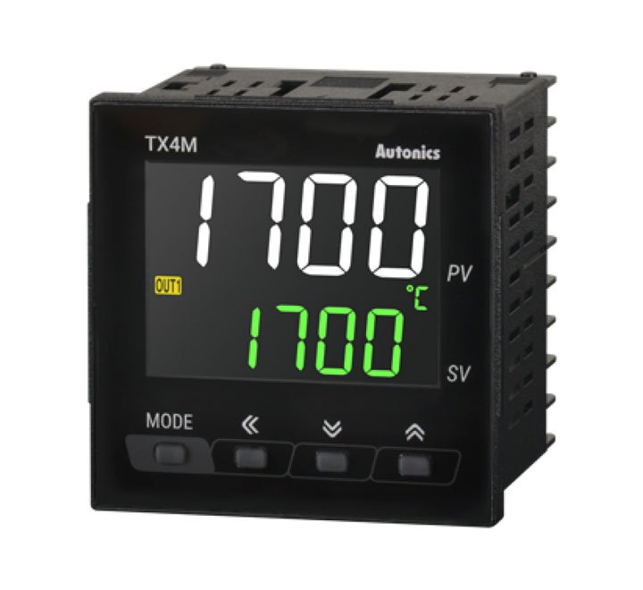 Термоконтролер TX4M-14R с тип изход 2 релейни, захранващо напрежение 100-240VAC и температурен диапазон от -50 до 1200°C. Контакти NO и габаритни размери 72x72x51мм.