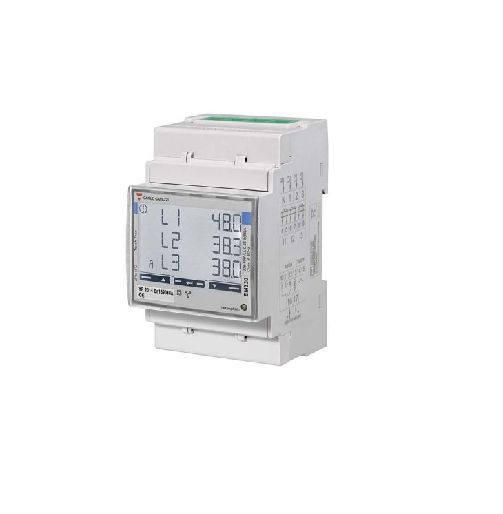 Цифров електромер EM330DINAV53HO1X с номинално напрежение 230/400V, работна честота 45-65Hz и максимален ток 6A. Клас на точност B и монтаж DIN шина.