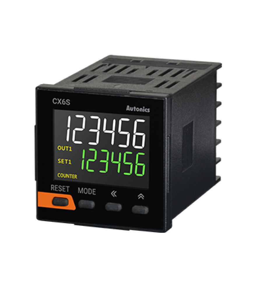 Брояч на импулси/време CX6S-1P4 със захранващо напрежение 100-240VAC, товароносимост на контактите 250VAC/3A; 30VDC/3A и обхват -99999 до 999999 импулса.