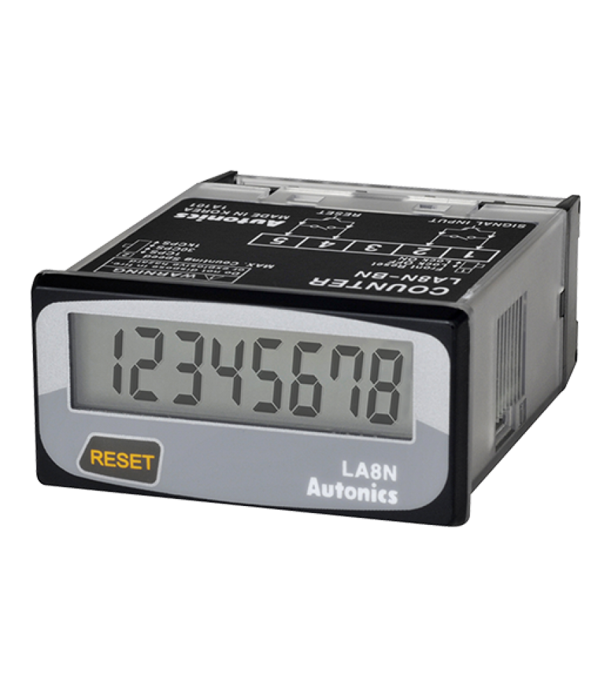 Брояч на импулси LA8N-B 3VDC 8-разряден със захранващо напрежение 3VDC, обхват осемразряден -9999999 до 99999999 импулса и вид вход механичен контакт. Начин на нулиране механичен/електронен и габаритни размери 48x24x58мм.