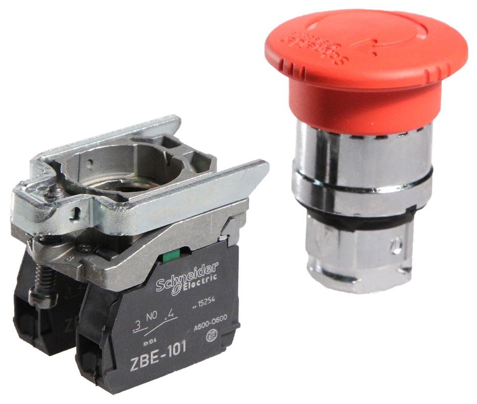 Бутон тип гъба Schneider electric XB4BS8445 с конфигурация на контактите NO+NC, макс. напрежение 240VAC и макс. ток 3A. Монтаж за панел и размери ф40мм.