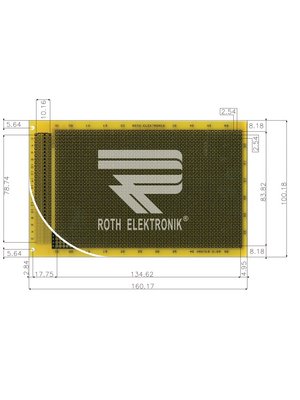 Двустранна универсална платка RE201-LFDS ROTH ELEKTRONIK GMBH с габаритни размери 100×160мм, растер 2.54мм и дебелина 1.5мм.