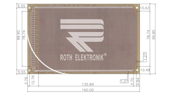 Двустранна универсална платка RE437-LF ROTH ELEKTRONIK GMBH с габаритни размери 100×160мм, растер 1.27мм и дебелина 1.5мм. Материал текстолит FR4; епоксидна смола подсилена със стъклено влакно.