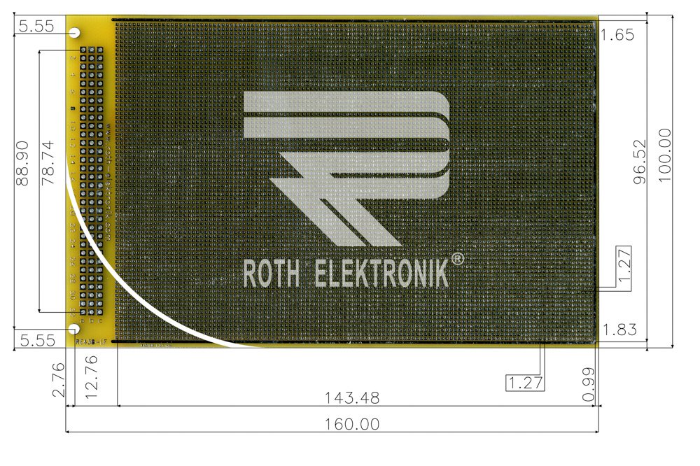 Двустранна универсална платка RE438-LF ROTH ELEKTRONIK GMBH с габаритни размери 100×160мм, растер 1.27мм и дебелина 1.5мм. Материал текстолит FR4; епоксидна смола подсилена със стъклено влакно.