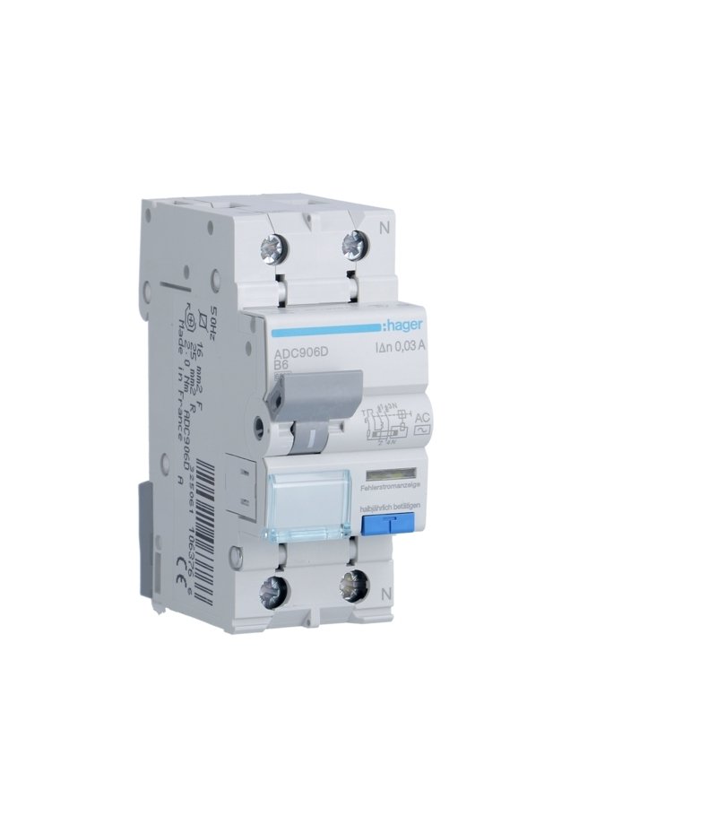 Дефектнотокова защита ADC906D с номинално напрежение 240VAC, номинален ток 6A и диференциален ток 30mA. Ток на късо съединение 6kA и монтаж DIN шина.