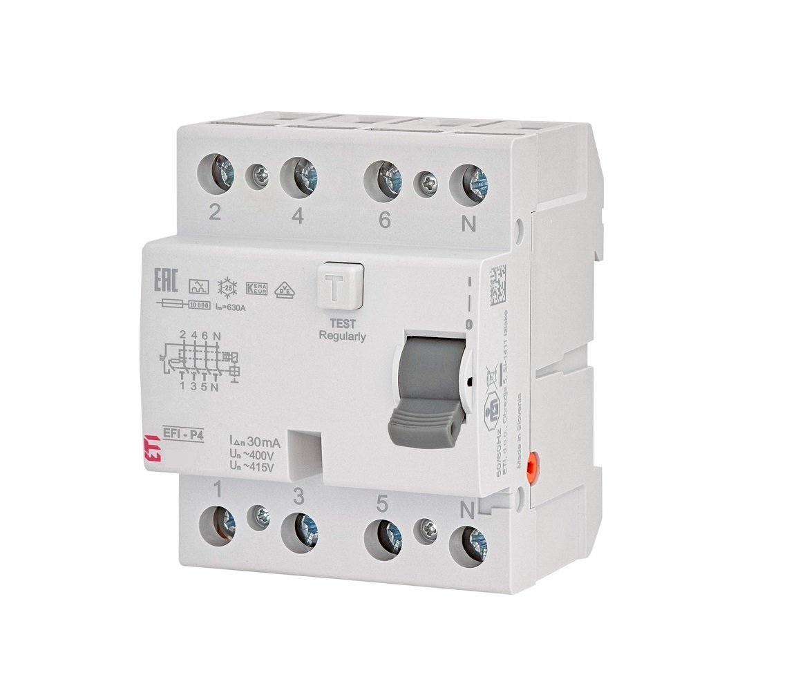 Дефектнотокова защита EFI-P4-AC 32/0.03 с номинално напрежение 230/400V, номинален ток 32A и диференциален ток 30mA. Ток на късо съединение 10kA и монтаж DIN шина.