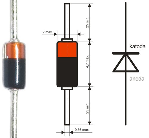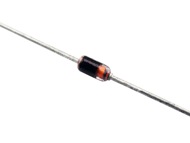 Диод KA261 (BAV17) с ток в права посока 0.1A, пад на напрежението в права посока <1V и макс. обратно напрежение 50V. Брой изводи 2 и диаметър 2мм.