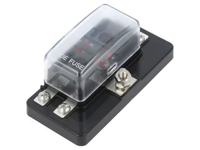 Държач за 4 предпазителя R3-76-07-3L104 19мм с товароносимост 32VDC/30A, материал на корпуса термопластмаса и габаритни размери 100x47x41мм. За обемен монтаж.