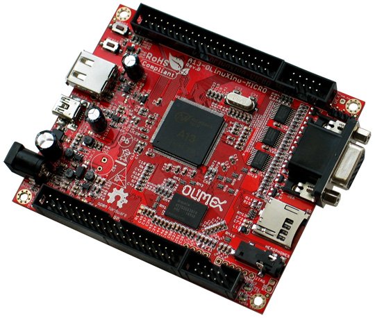 Едноплатков компютър A13-OLINUXINO-MICRO със захранващо напрежение 5VDC, процесор ARM A13 и архитектура Cortex A8. Графична система ARM Mali-400GPU, RAM памет 256MB DDR3 и габаритни размери 100×85мм.
