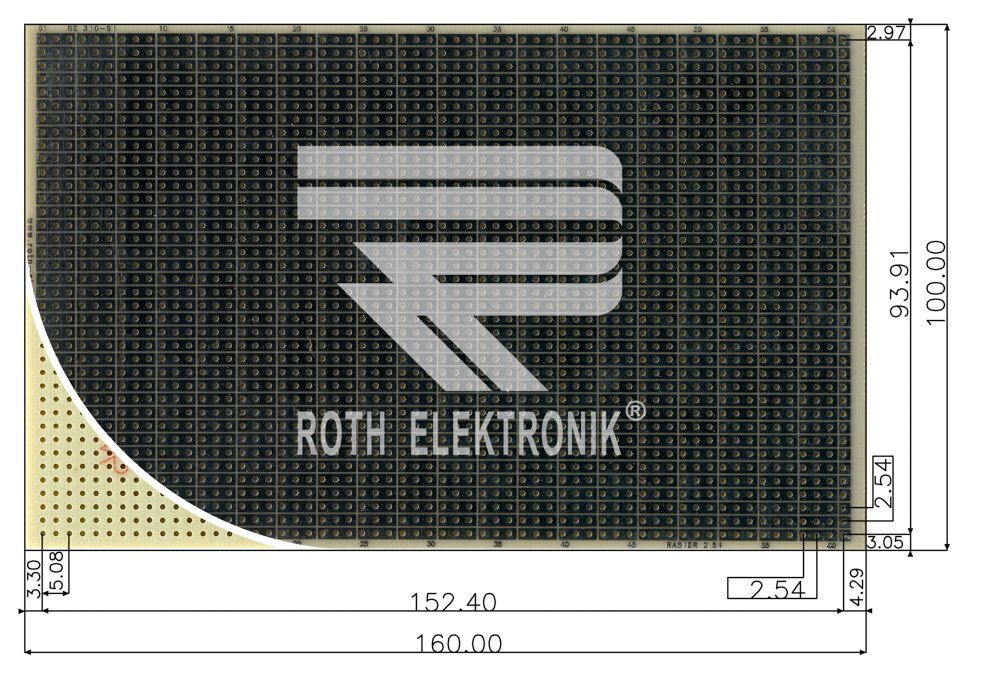 Едностранна универсална платка RE310-S1 ROTH ELEKTRONIK GMBH с габаритни размери 100×160мм, растер 2.54мм и дебелина 1.5мм. Материал текстолит CEM3.
