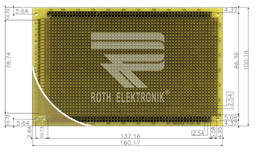 Едностранна универсална платка RE318-LF ROTH ELEKTRONIK GMBH с габаритни размери 100×160мм, растер 2.54мм и дебелина 1.5мм. Материал текстолит FR4; епоксидна смола подсилена със стъклено влакно.