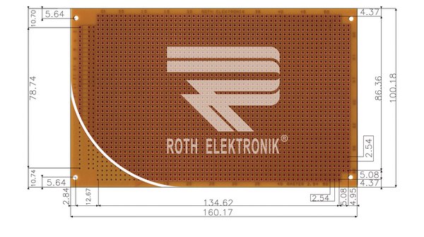 Едностранна универсална платка RE319-HP ROTH ELEKTRONIK GMBH с габаритни размери 100×160мм, растер 2.54мм и дебелина 1.5мм. Материал текстолит FR2.