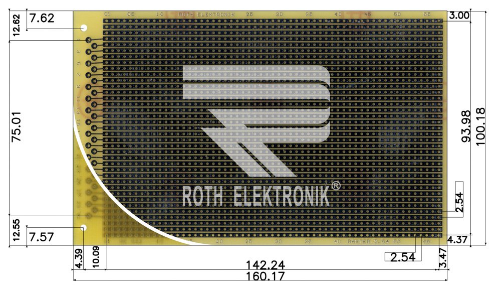 Едностранна универсална платка RE522-LF ROTH ELEKTRONIK GMBH с габаритни размери 100×160мм, растер 2.54мм и дебелина 1.5мм. Материал текстолит FR4; епоксидна смола подсилена със стъклено влакно.
