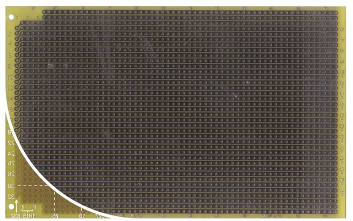 Едностранна универсална платка RE527-LF ROTH ELEKTRONIK GMBH с габаритни размери 100×160мм, растер 2.54мм и дебелина 1.5мм. Материал текстолит FR4; епоксидна смола подсилена със стъклено влакно.
