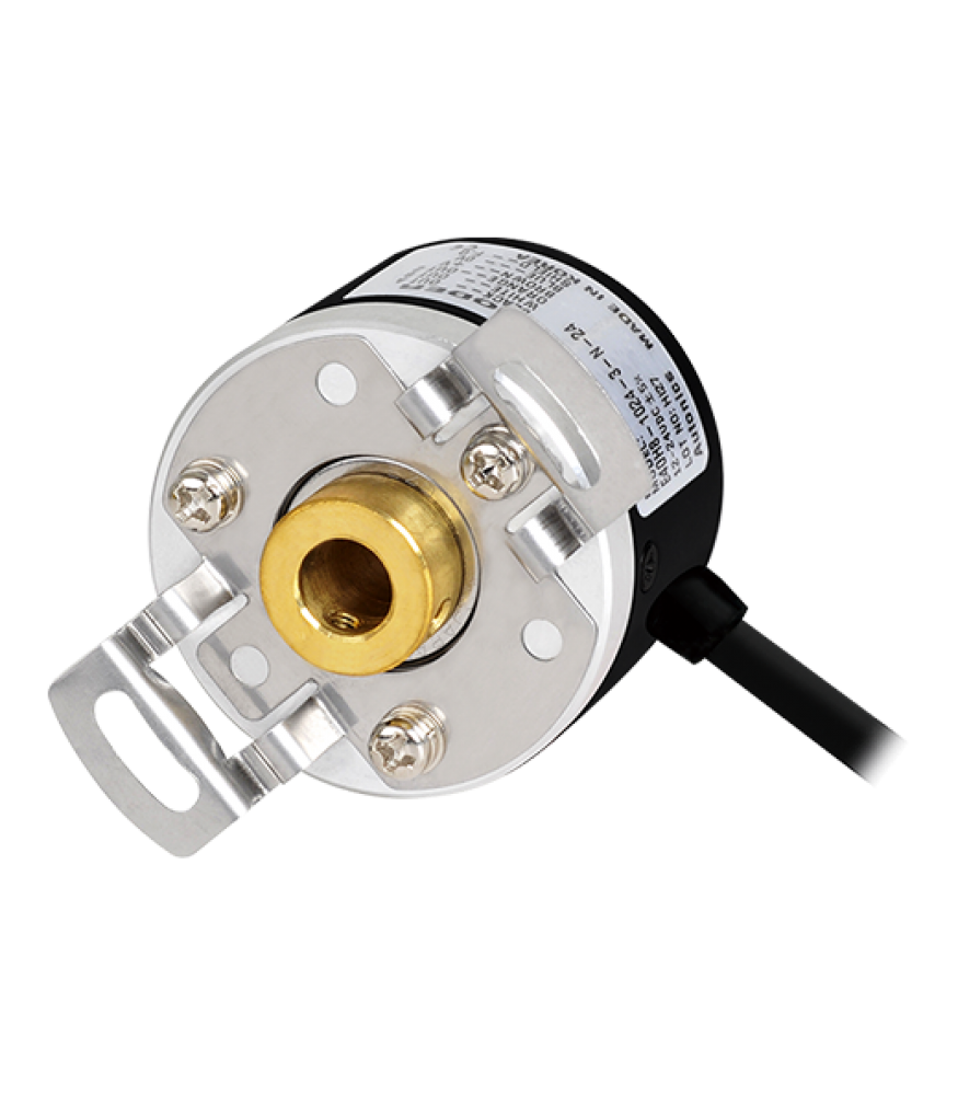 Енкодер E40H10-250-3-T-24 със захранващо напрежение 12-24VDC, резолюция 250имп./об и честота на превключване 300kHz. Диаметър на оста ф10мм, габаритни размери ф40×40мм и степен на защита IP50.