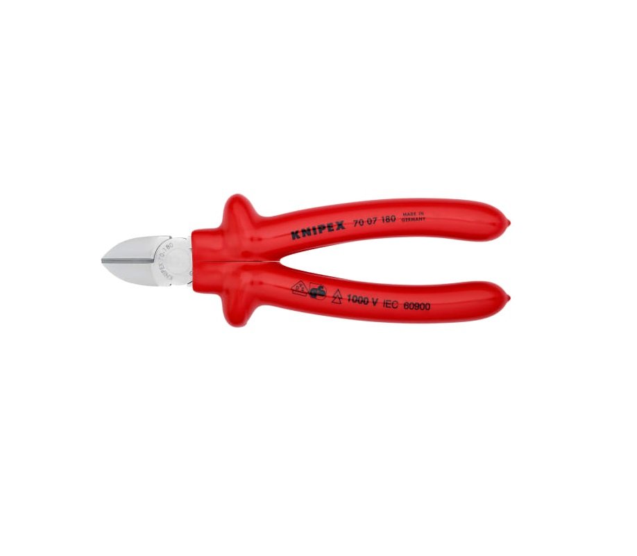 Изолирани клещи резачки 7007180 KNIPEX, материал на инструмента стомана. Дължина на инструмента 180мм и съответствие VDE.