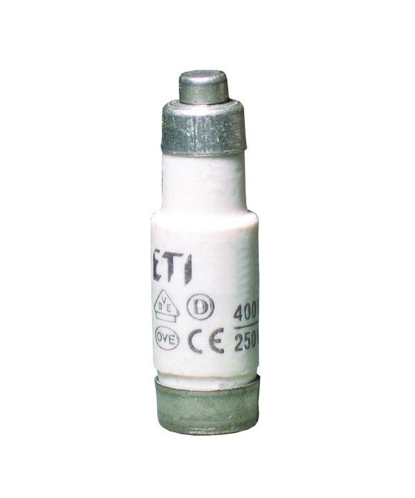 Индустриален предпазител 002211001 ETI с номинално напрежение 250VDC; 400VAC, номинален ток 2A и способност за изключване 8kA/250VDC; 50kA/400VAC. Характеристика gG и размер на предпазителя D01.