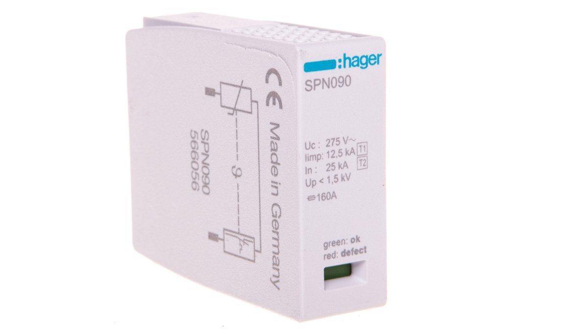 Катоден отводител SPN090 HAGER с максимален разряден ток 12.5kA, ниво на защита по напрежение 1.25kV и количество полюси 1. Степен на защита IP20 и монтаж цокъл.