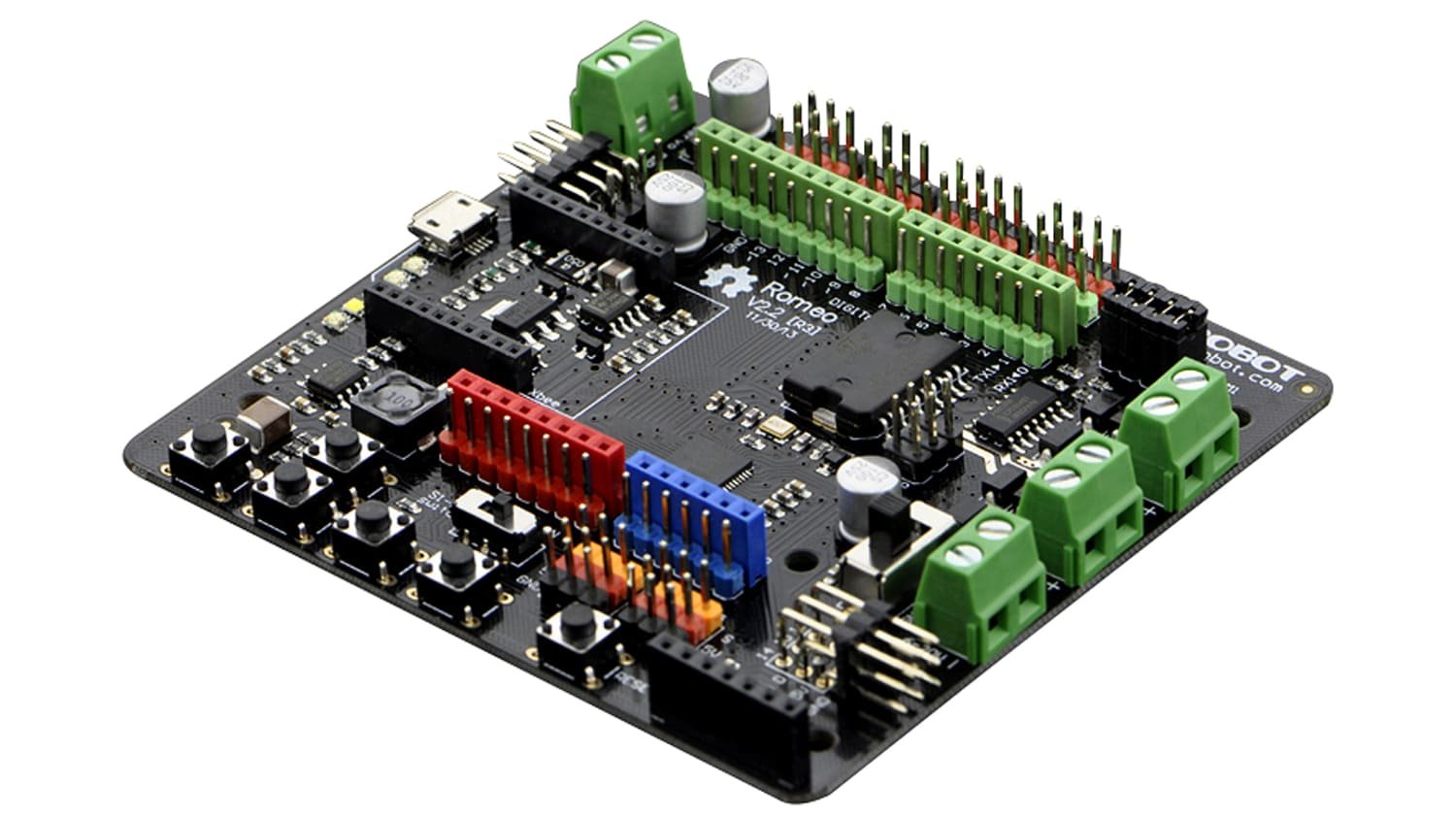 Контролер за управление на робот DFR0225 с вградено Arduino и интегриран контролер за двигатели, захранващо напрежение 6-23VDC и микроконтролер ATMEGA32U4.