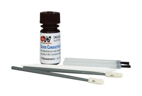 Лак за рисуване на писти CW2205 CHEMTRONICS със състав на комплекта проводим лак 5гр; 1x пръчка; 2x стик; 2x четка и приложение рисуване на проводими писти.