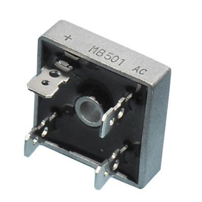 Мостов изправител KBPC5001 с ток в права посока 50A и пад напрежение в права посока 1.1V. Максимално обратно напрежение 100V и корпус MB-25.