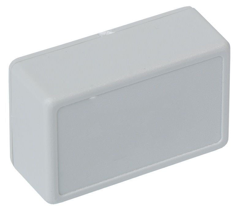 Универсална пластмасова кутия с габаритни размери 45x28x18мм, материал ABS и сив цвят.