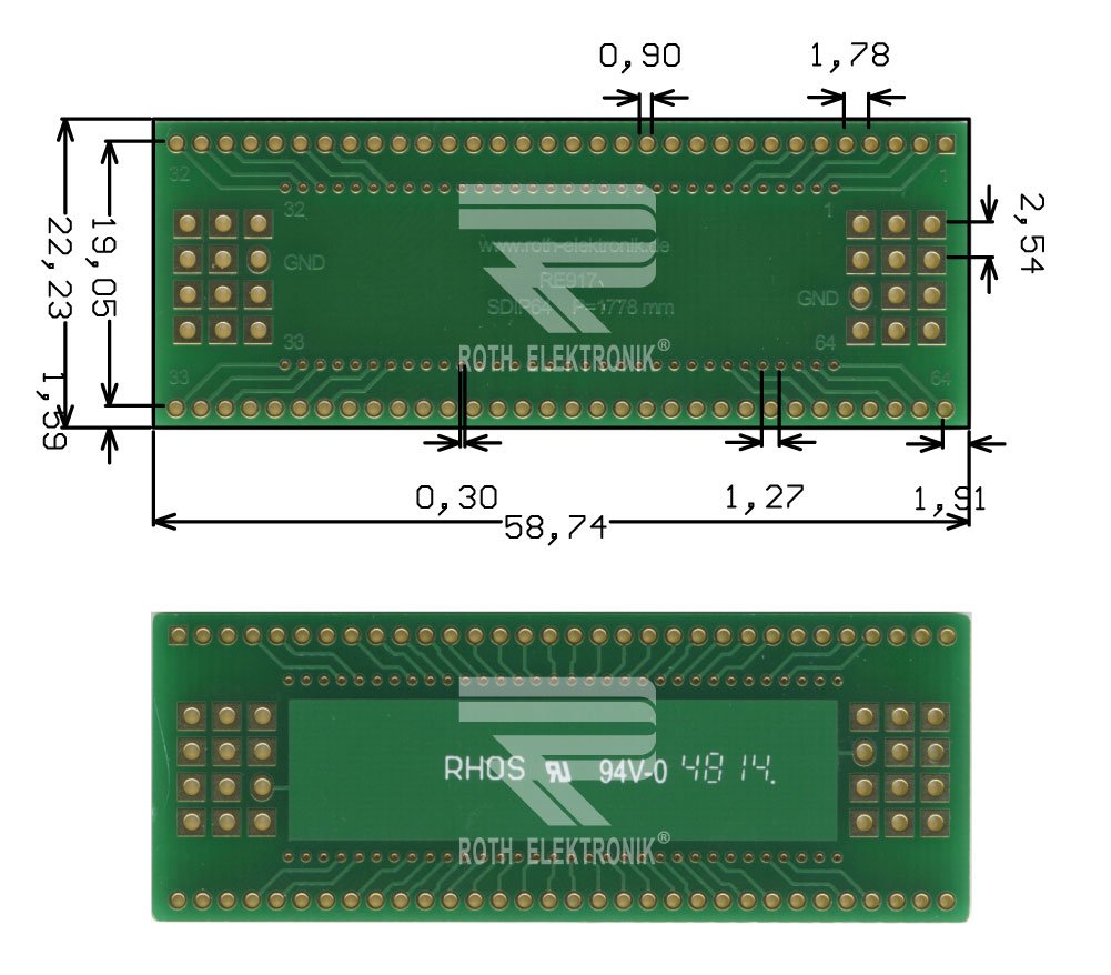 Преходна платка /универсална платка мулти адаптер/ RE917 ROTH ELEKTRONIK GMBH SDIP64 с габаритни размери 65.4×30.14мм, дебелина 1.5мм и материал текстолит FR4; епоксидна смола подсилена със стъклено влакно.