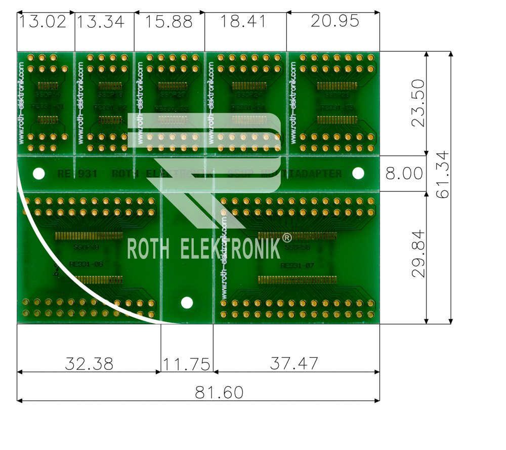 Преходна платка /универсална платка мулти адаптер/ RE931 ROTH ELEKTRONIK GMBH с габаритни размери 61.4×81.7мм, дебелина 1.5мм и материал текстолит FR4; епоксидна смола подсилена със стъклено влакно.