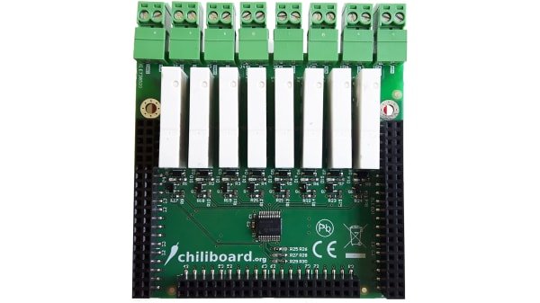 Разширителна платка RELAY GRINN с вид на контактите винтова клема и щифтово гнездо. Габаритни размери 78.8×74мм.