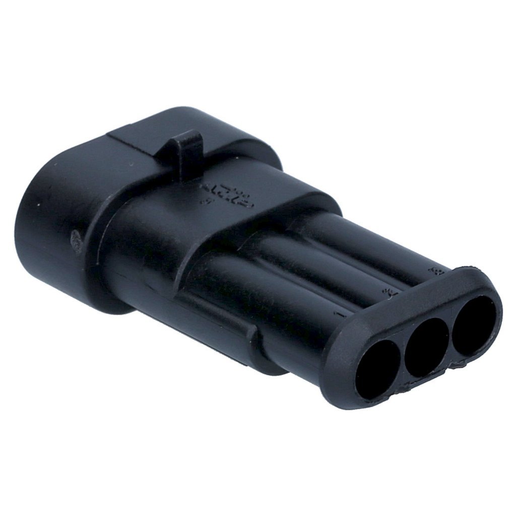 Съединител AMP-0-0282105-1 без пинове с номинално напрежение 24VDC, брой изводи 3 и материал полиамид. Степен на защита IP67 и габаритни размери 42х26х14мм.