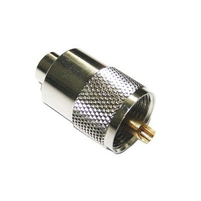 Съединител UHF мъжки кабелен/RG-58 с метод на връзка навиване и материал на корпуса метал.