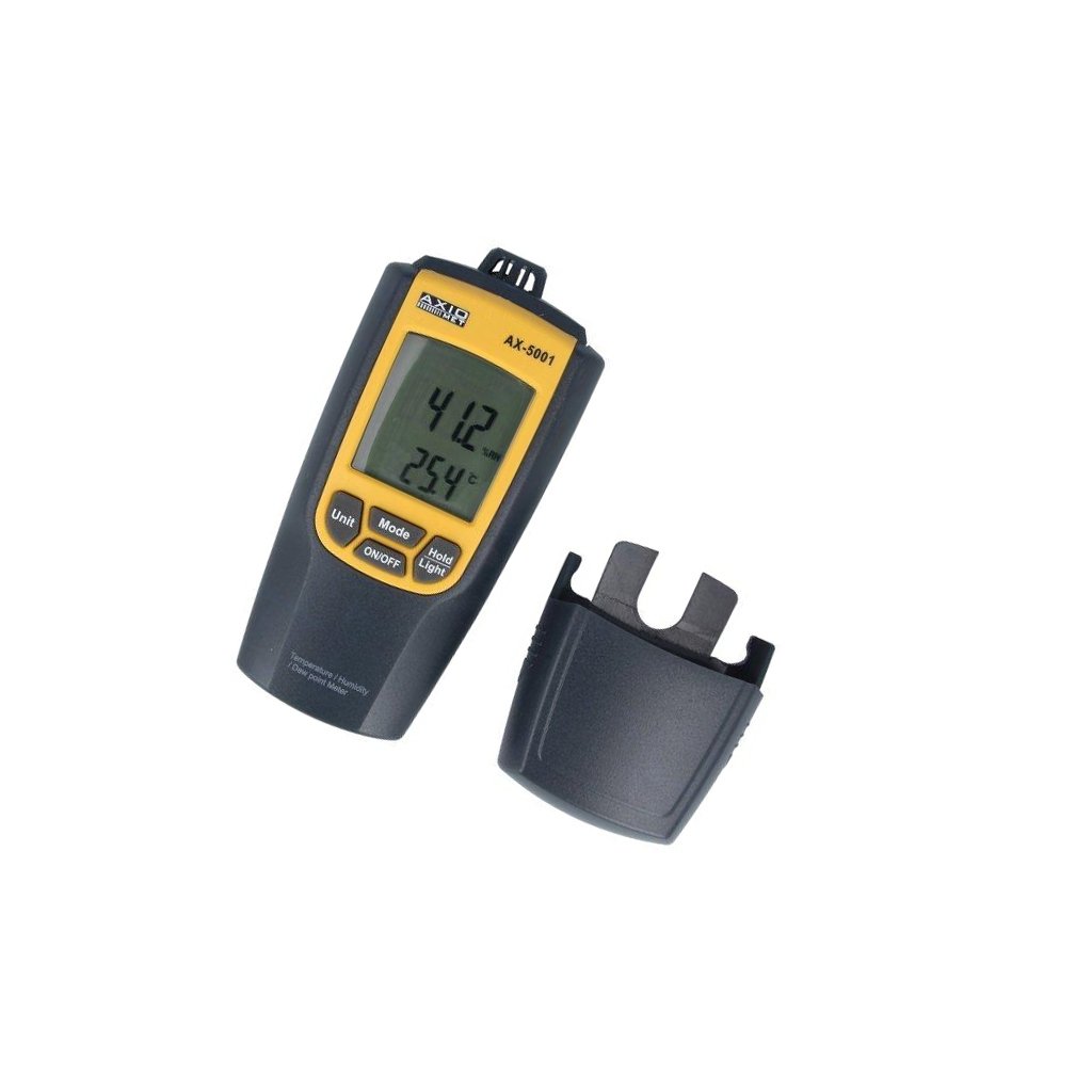 Термометър и влагомер AX-5001 с обхват температура -10-50°C ±1°C, обхват влажност 0-100%RH ±3% и габаритни размери 121x60x30мм. Захранване батерии 3х LR03 AAA 1.5V.