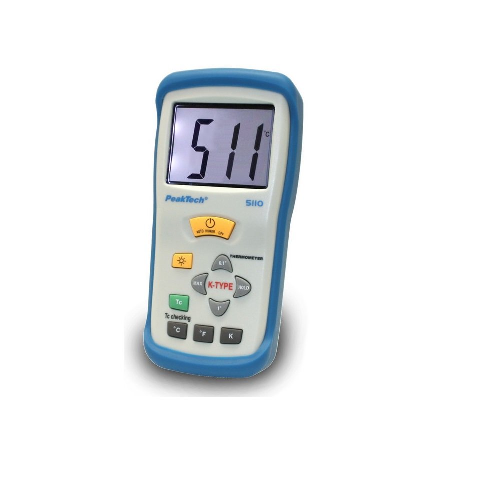 PeakTech P 5110 е удобно едноканално устройство за измерване на температура. Има голям 3 ½-цифрен, осветен LCD дисплей и различни измервателни функции като максимална стойност и задържане на данни.