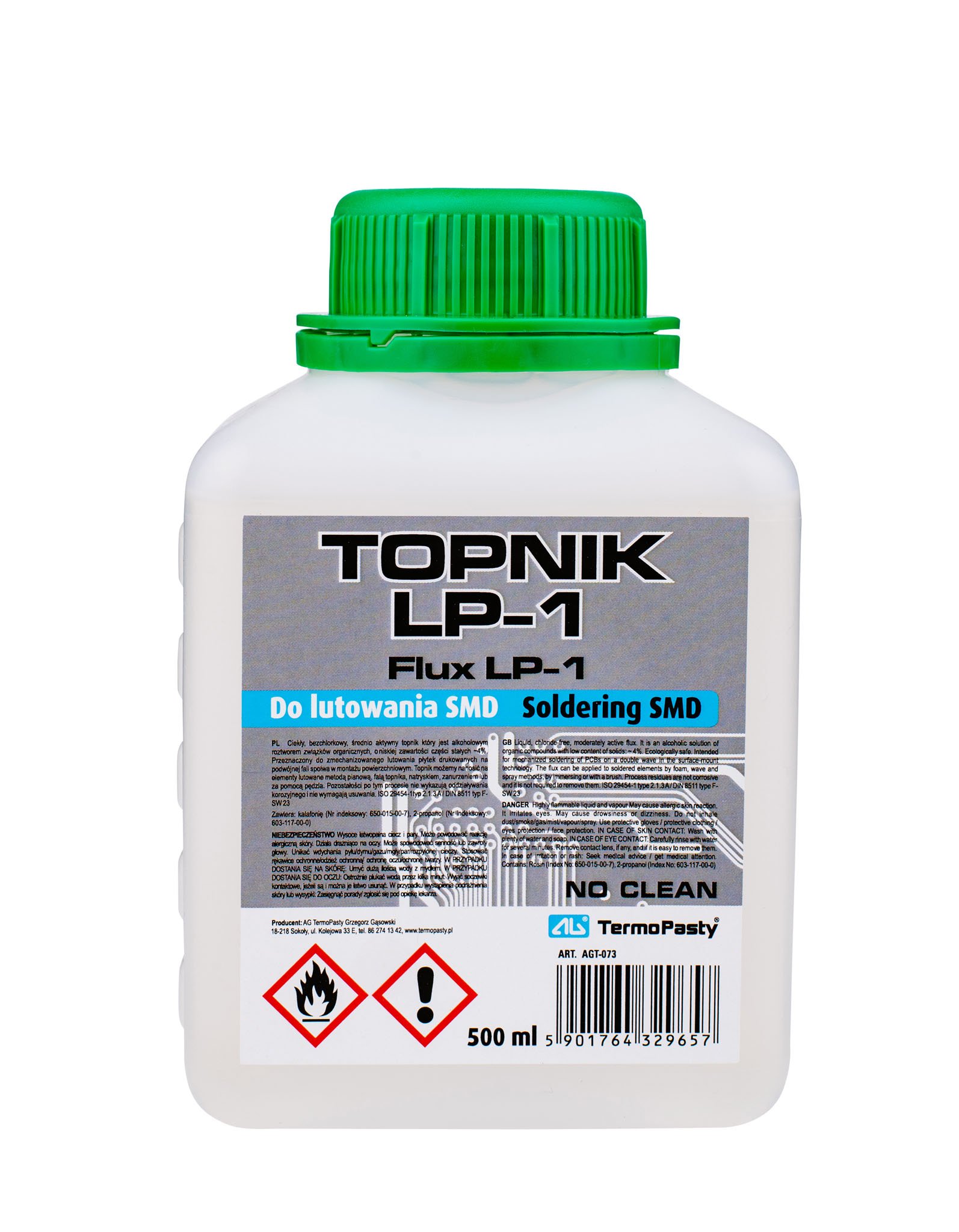 Флюс колофонов LP1 ART.AGT-073, вид Lead Free; No Clean; безхалогенни със съдържание на твърди частици 4% и плътност 860mg/cm3 при 20°C. Обем 500мл.