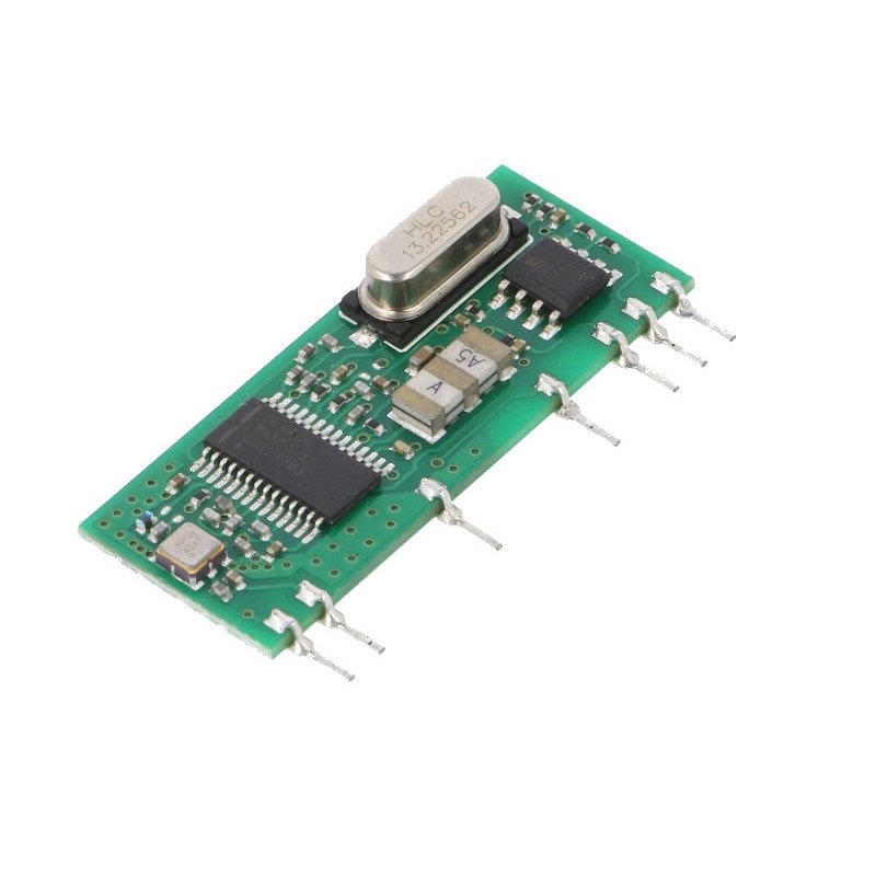 RF модул RCASK4-434-CH RADIOCONTROLLI приемник AM със захранващо напрежение от 4.5 до 5.5VDC, консумация на ток 7.5mA и честота 433.92MHz. Чувствителност -113dBm и габаритни размери 36.5×14.5мм.