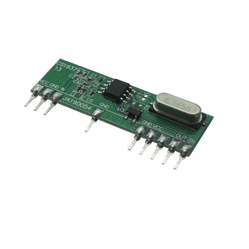 RF модул RCRX1-434 RADIOCONTROLLI приемник AM с модулация OOK, захранващо напрежение от 2 до 5.5VDC и консумация на ток 5.5mA. Честота 433.92MHz, чувствителност -113dBm и габаритни размери 38×12мм.
